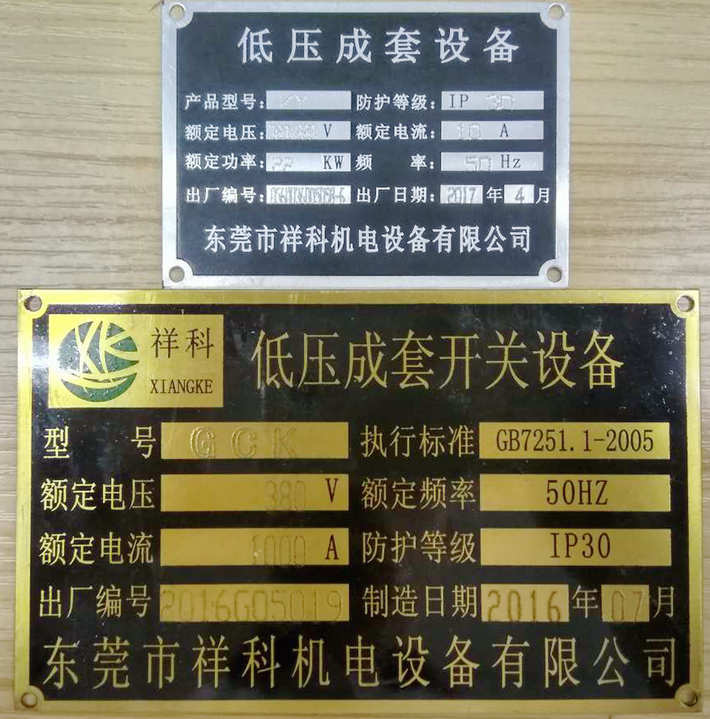 開關柜銘牌可一目了然地讓操作者了解開關柜的一些基本參數,以及開關柜生產廠家的一些信息。所以銘牌在開關柜中很重要,在開關柜交付的時候,開關柜上必須安裝銘牌。