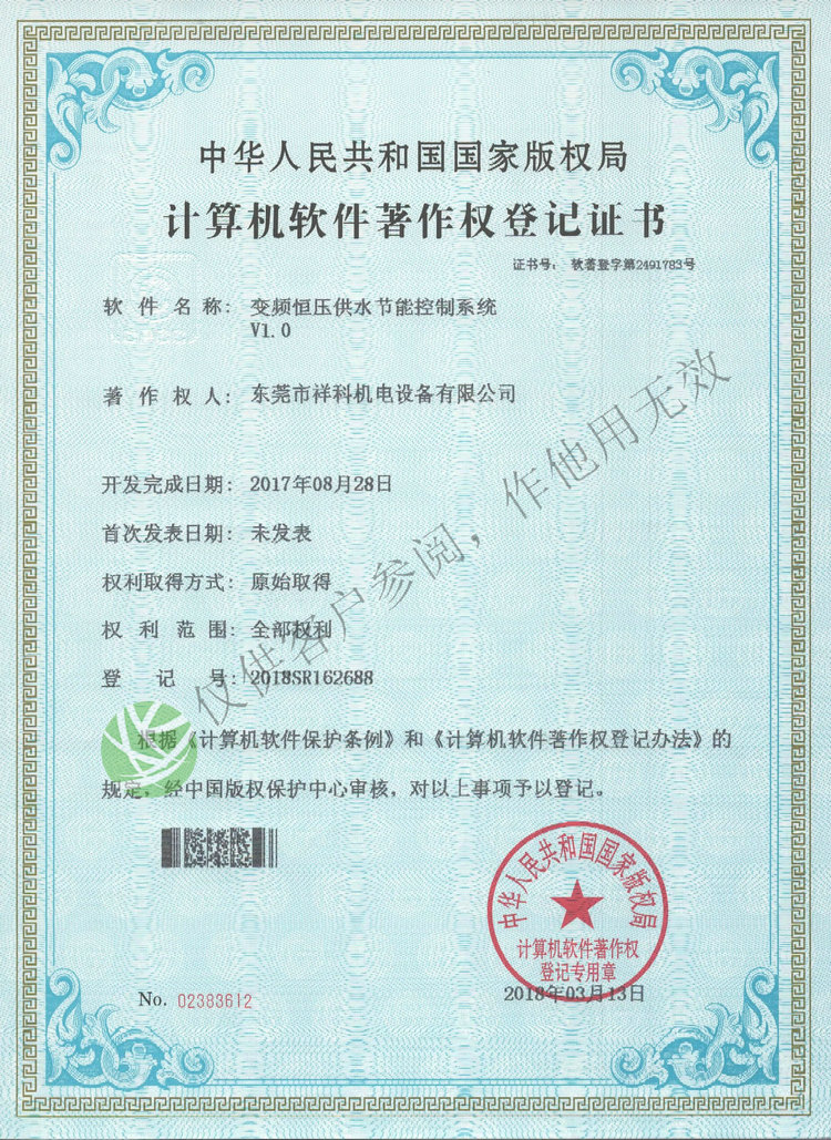 祥科的“變頻恒壓供水節能控制系統”已獲得國家計算機軟件著作權證書。